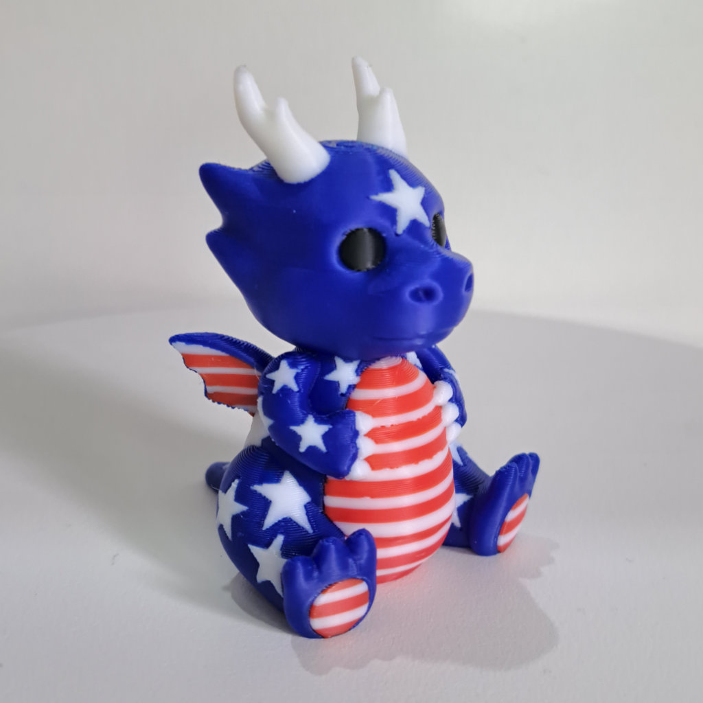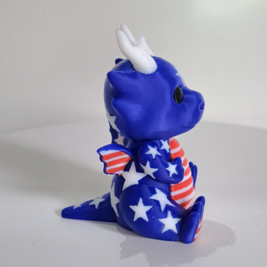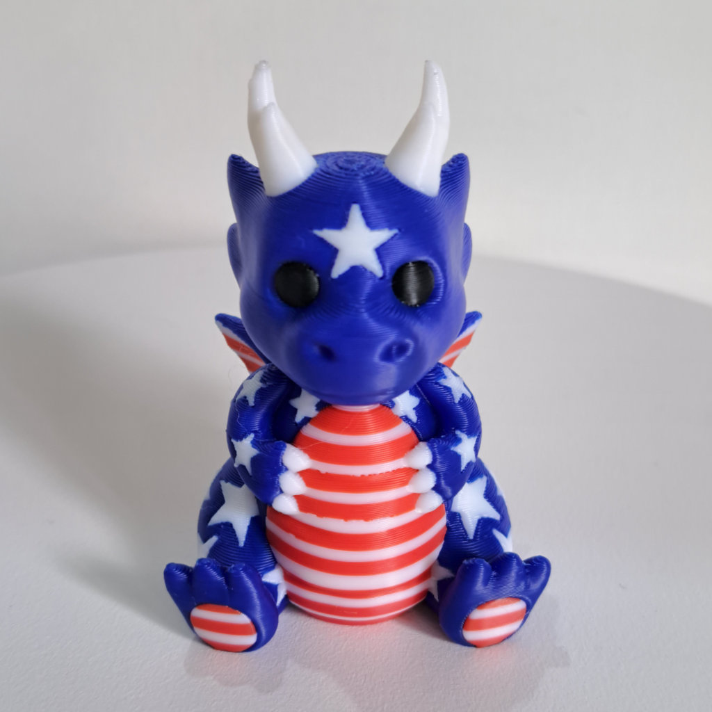 Featuring a striking red, white, and blue colour scheme with star accents and a striped belly, this dragon blends playful character with iconic styling.